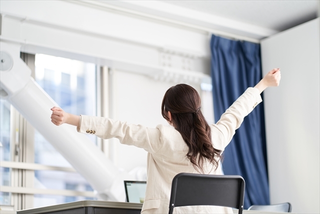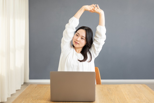 同じ姿勢を続けると筋肉が固まるため、1時間に1度は席を立って、首や肩をゆっくり回すストレッチをすると良いでしょう。